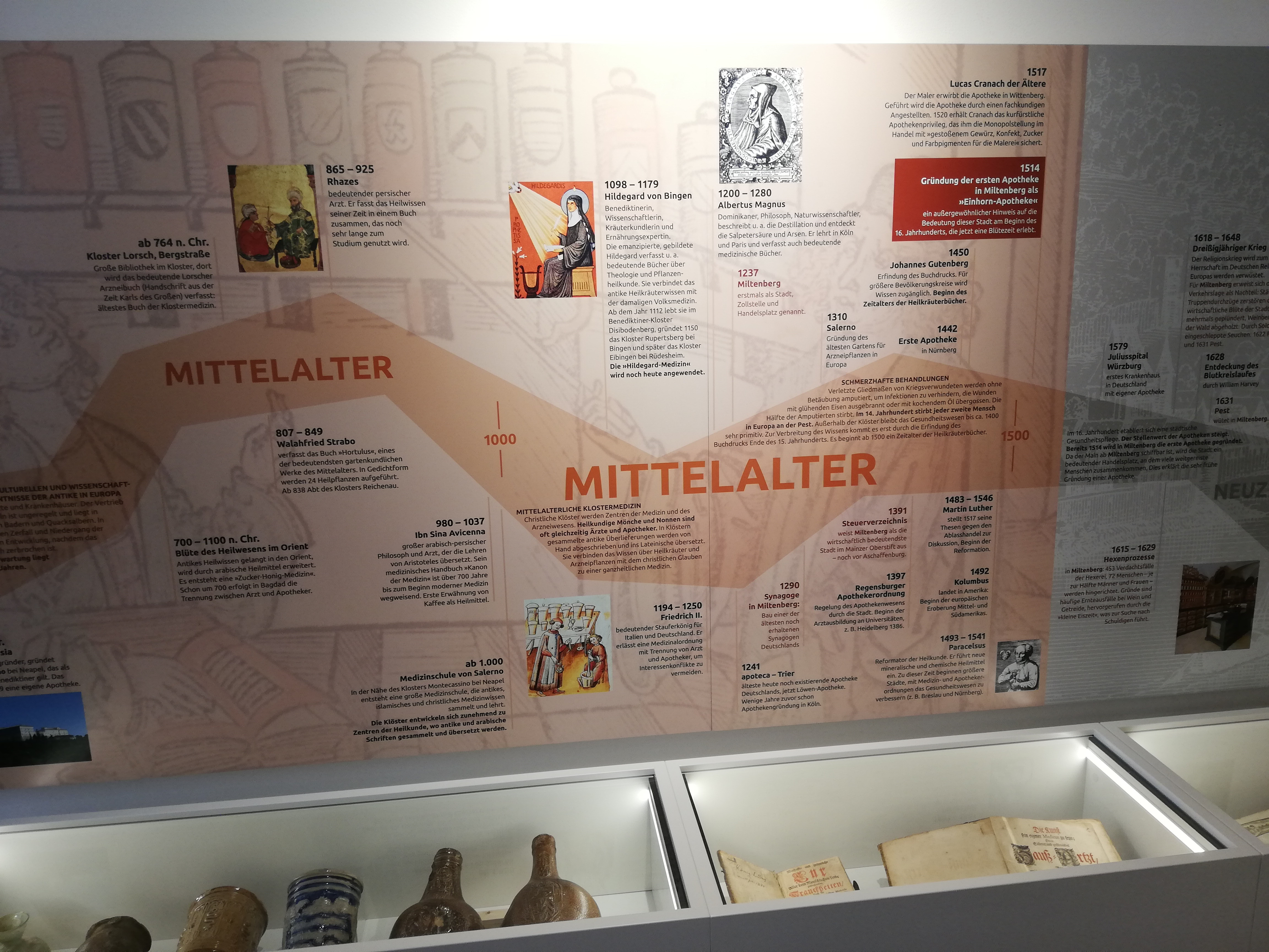 Im Hauptraum des Apothekenmuseums gibt nun eine große Informationswand einen Überblick über wichtige Errungenschaften und Persönlichkeiten des Apotheken- und Medizinwesens in Europa, von der Antike über das Mittelalter bis in die Neuzeit.